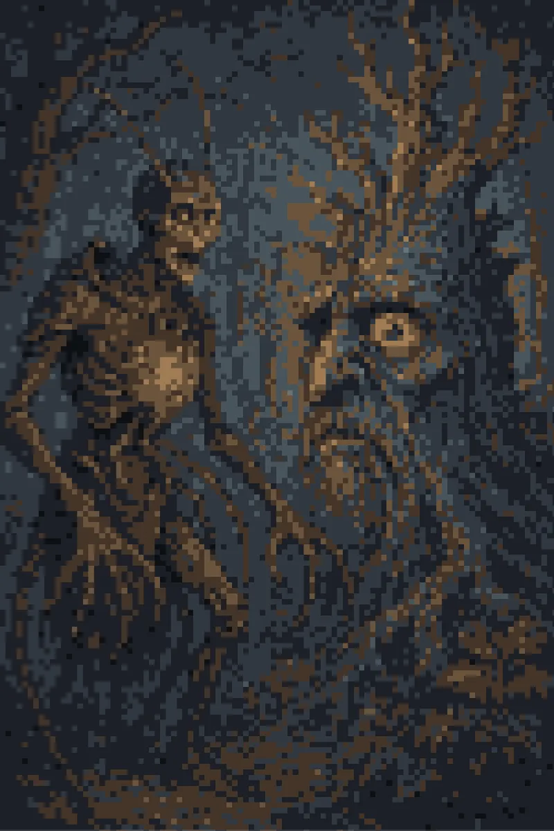 You run with your Lady along the swaying branch, toward the Ent that is mottled grey. A pine. The grey-shapes are not leaves, you now see, but calcified pinecones, with some of their grey bleeding into the wood.