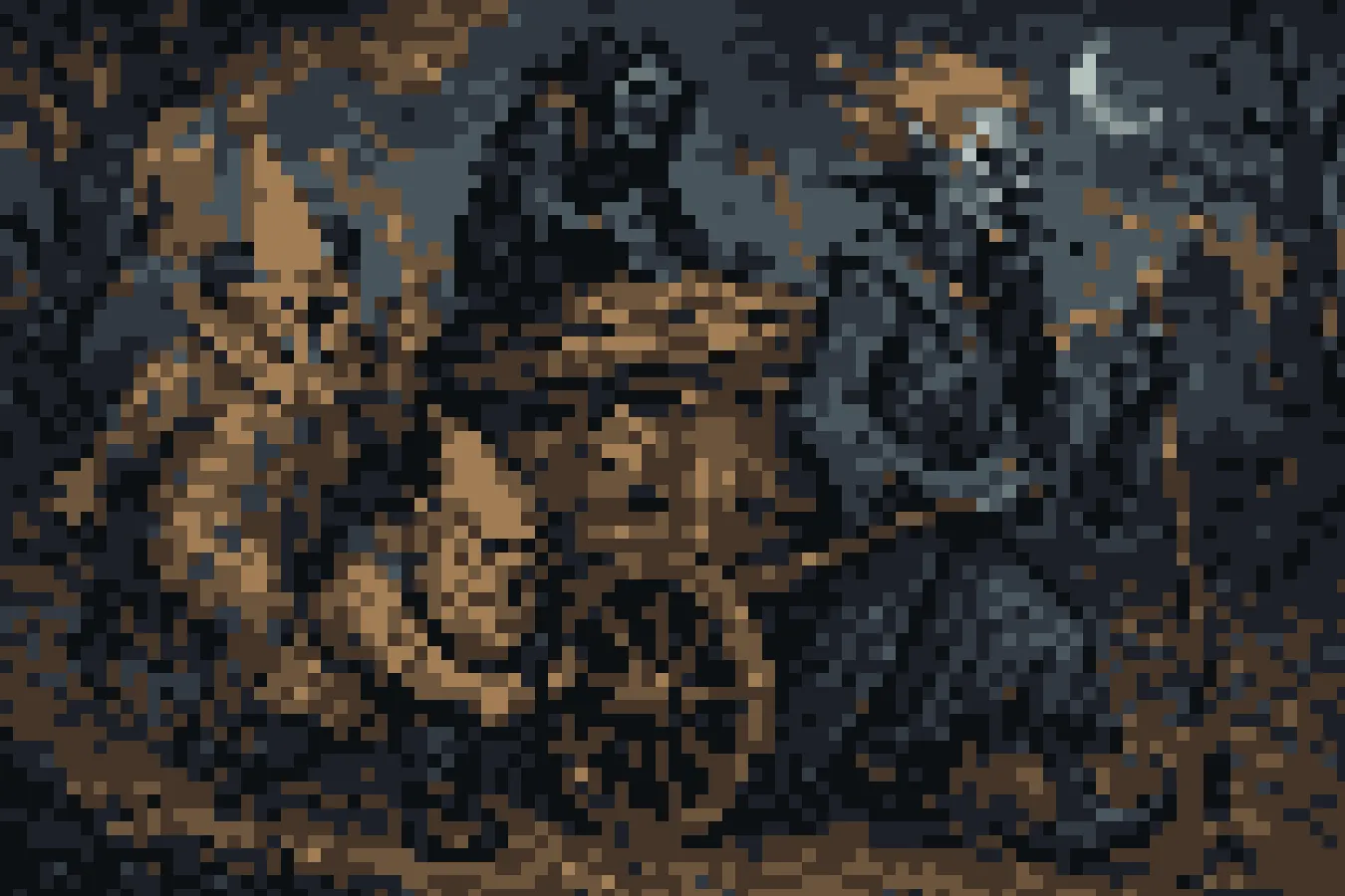 From the wagon’s opposite side, a horse’s nicker sounds. In a whisper R suggests you steal a pair of steeds and leave.