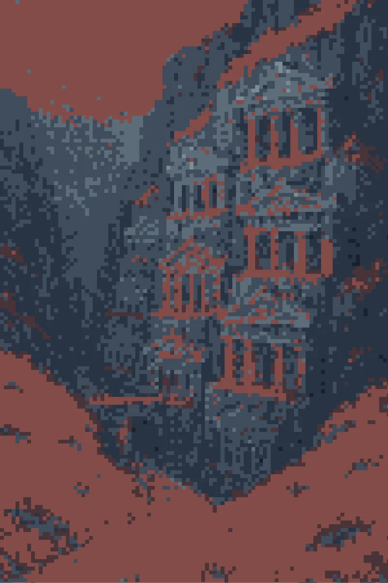 Originally the white marble facades which open onto the wide sandstone terraces were tohmbs. Layer after layer. Tohmb after tohmb. Descending down into the unplumbed trough. Over many Times, the upper tohmbs were repurposed for living space. The town grew, and crept down, though it never plunged beyond at least the echo of refracted sunlight.
